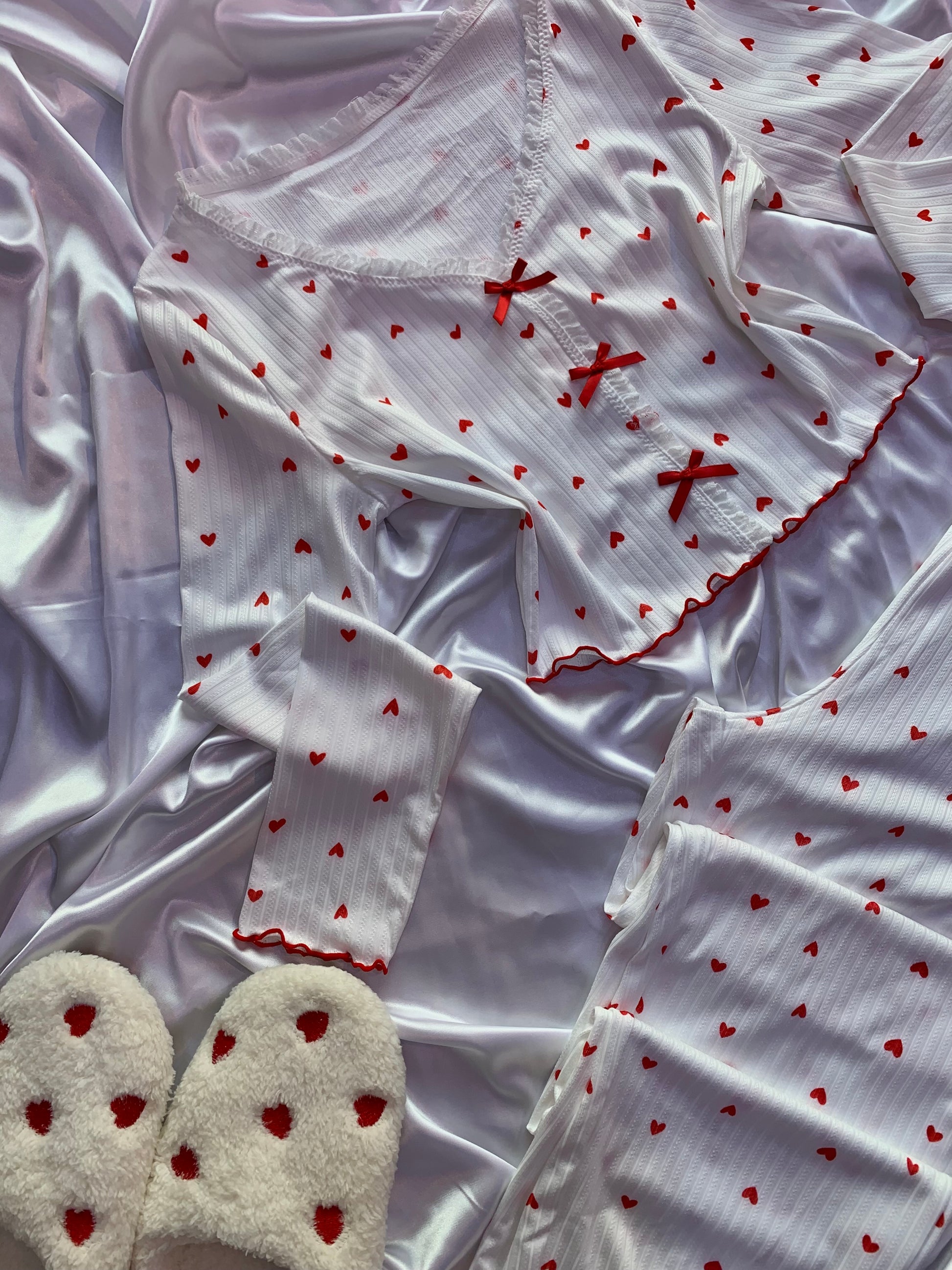 Ce pyjama blanc à motif cœur, avec un nœud élégant sur le devant et des finitions en bordure ondulée, est parfait pour des nuits confortables et stylées.